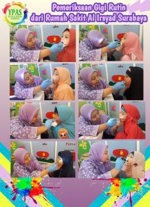 Seperti dokter gigi yang datang ke sekolahku, di Playgroup-TK Al Irsyad. Setiap 6 bulan sekali, ada dokter gigi yang datang ke sekolah untuk memeriksa kesehatan gigiku dan teman-teman semua. Seperti hari Jum’at dan sabtu lalu, 25-26 Oktober 2019, aku dan teman-teman tidak takut, gigi kami diperiksa oleh dokter didampingi oleh bu guru dan perawat juga.